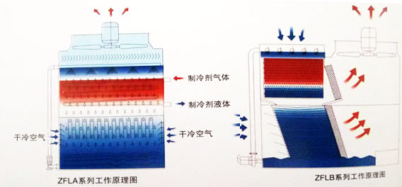 ZNX型蒸發(fā)式冷凝器以水和空氣為冷卻介質(zhì)與盤(pán)管內(nèi)的高溫氣態(tài)制冷劑進(jìn)行熱交換制冷劑由氣態(tài)冷凝成液態(tài)。內(nèi)部設(shè)水分配系統(tǒng)、根冷凝盤(pán)管組、填料熱交換層、除水器等。外部設(shè)循環(huán)水泵、盆管側(cè)面頂部設(shè)軸流風(fēng)機(jī)。在軸流風(fēng)機(jī)的作用下,內(nèi)部成負(fù)壓狀態(tài)。工作時(shí),冷卻水由水分配系統(tǒng)在強(qiáng)動(dòng)的風(fēng)力下均勻地完全覆蓋在盤(pán)管表面,高溫氣態(tài)制冷劑從盤(pán)管上部進(jìn)入,被冷凝的液態(tài)制冷劑從管底都流出,在該過(guò)程中,高溫制冷劑與盤(pán)管外的水、空氣進(jìn)行熱交換,再借助風(fēng)勢(shì),換熱效果顯著提高。冷卻水和空氣吸熱后溫度節(jié)別升高,部分冷卻水氣化形成水蒸氣,蒸發(fā)帶走大量的熱量由風(fēng)機(jī)吸走排入大氣,同時(shí)熱空氣中的水分被除水器截止集水池中,沒(méi)有被氣化的高溫冷卻水流入填料熱交換層被流經(jīng)的空氣帶走熱量使其冷卻,經(jīng)充分冷卻后的冷卻水流回集水池中供循環(huán)泵重新送入水分配系統(tǒng)繼續(xù)循環(huán)工作。數(shù)失到大氣中的水分由集水池內(nèi)的浮球閥控制水位,給予及時(shí)補(bǔ)充。